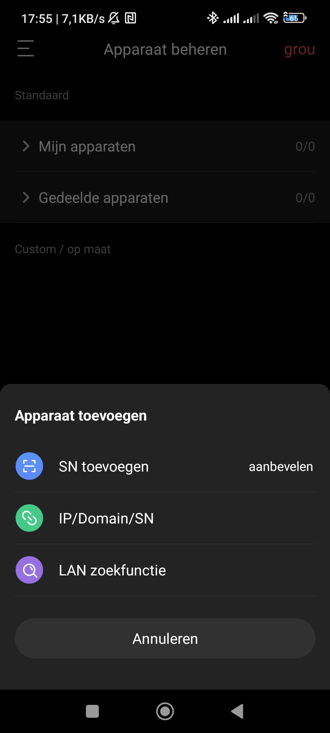Druk hier op de optie SN toevoegen. Deze heeft u nodig om de apparaten ook buiten uw netwerk te kunnen benaderen. De andere opties is voor gebruik in een lokaal netwerk.
